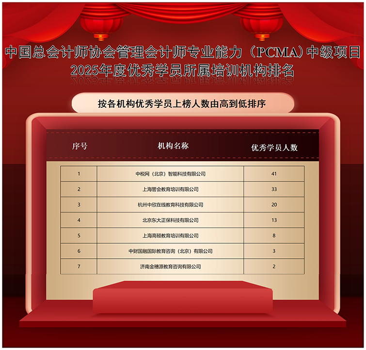 中国总会计师协会管理会计师专业能力(PCMA)中级项目2025年度优秀学员所属培训机构排名