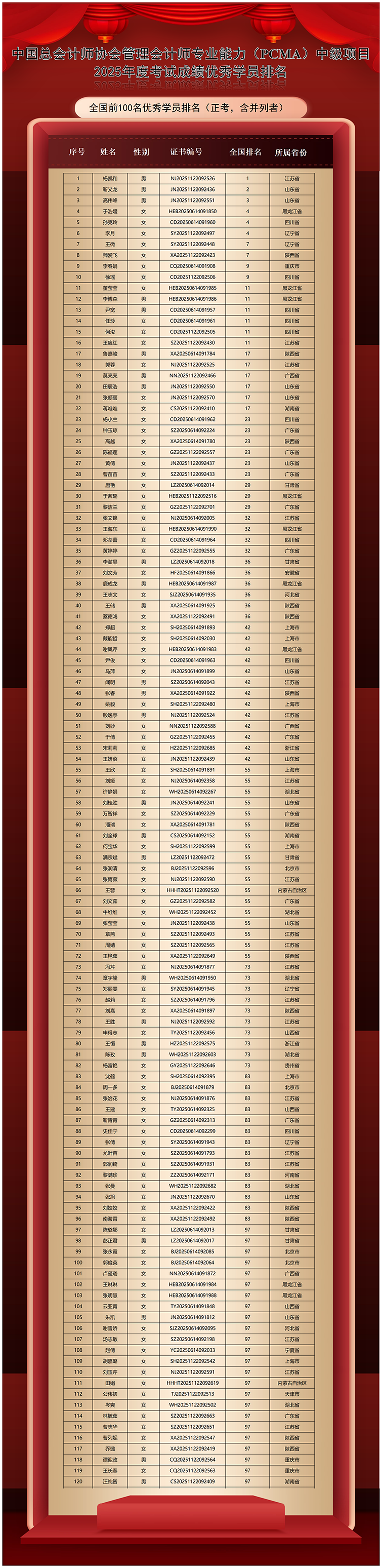 中国总会计师协会管理会计师专业能力(PCMA)中级项目2025年度考试成绩优秀学员排名